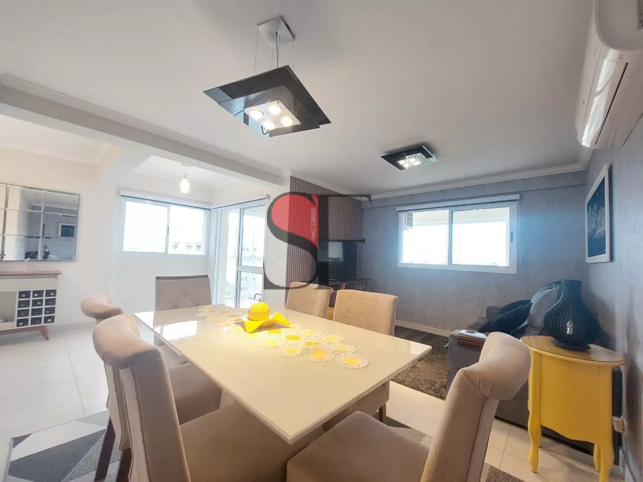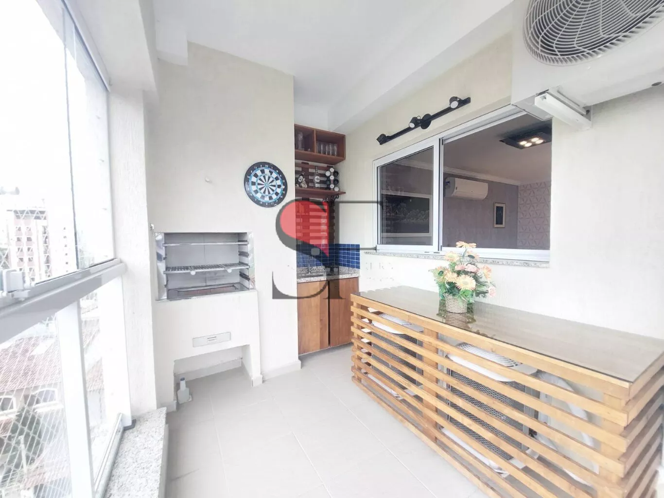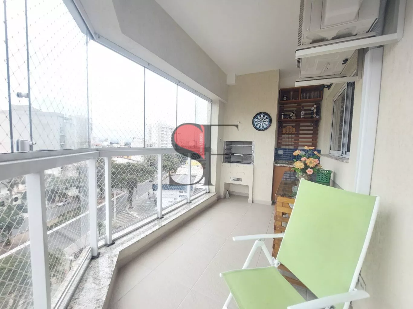 Sala de estar e jantar, com varanda gourmet envidraçada. Lavabo.