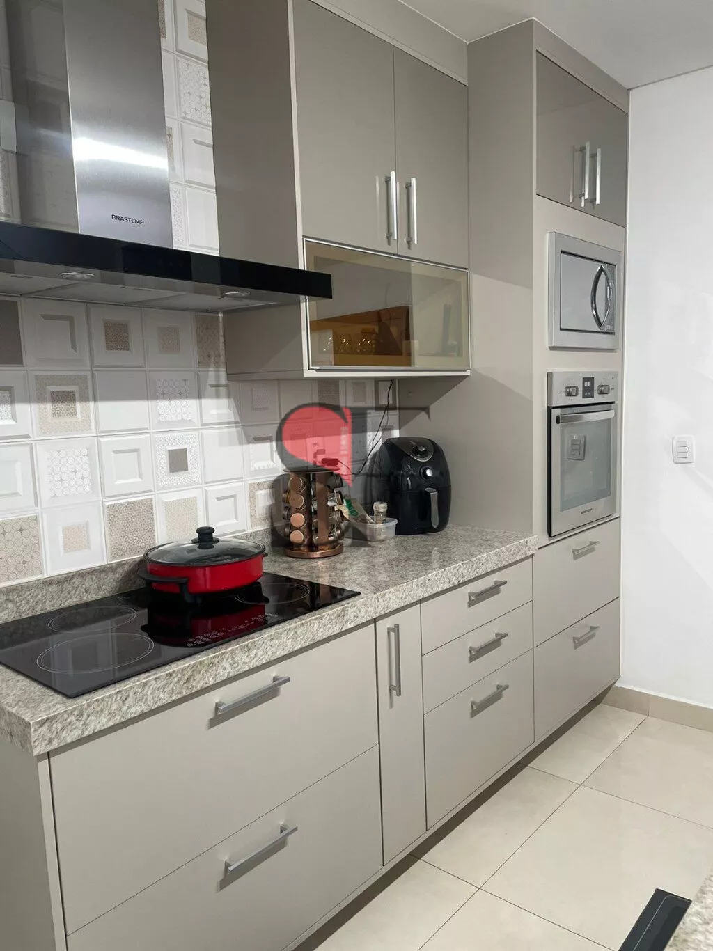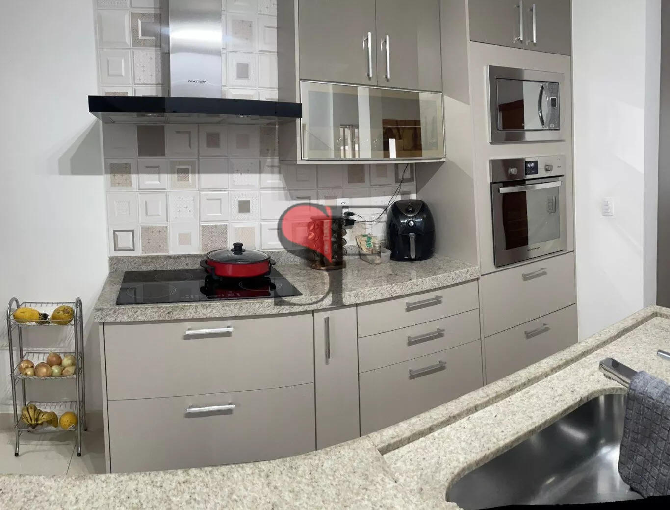 Cozinha completa com forno e microondas embutido, pia granito grande com bancada, cooktop indução, coifa Brastemp. Lavanderia ampla com móveis planejados e tanque em granito