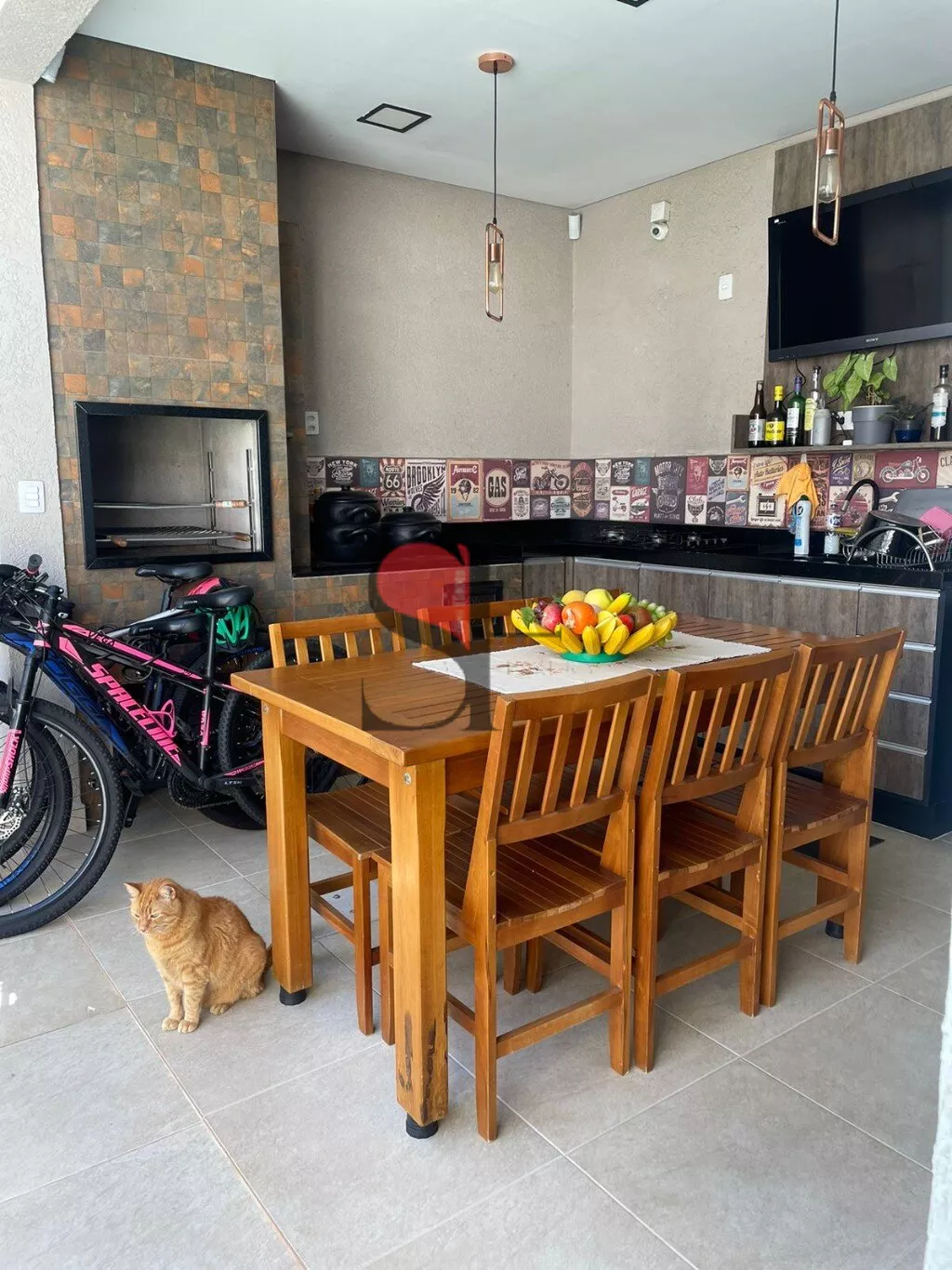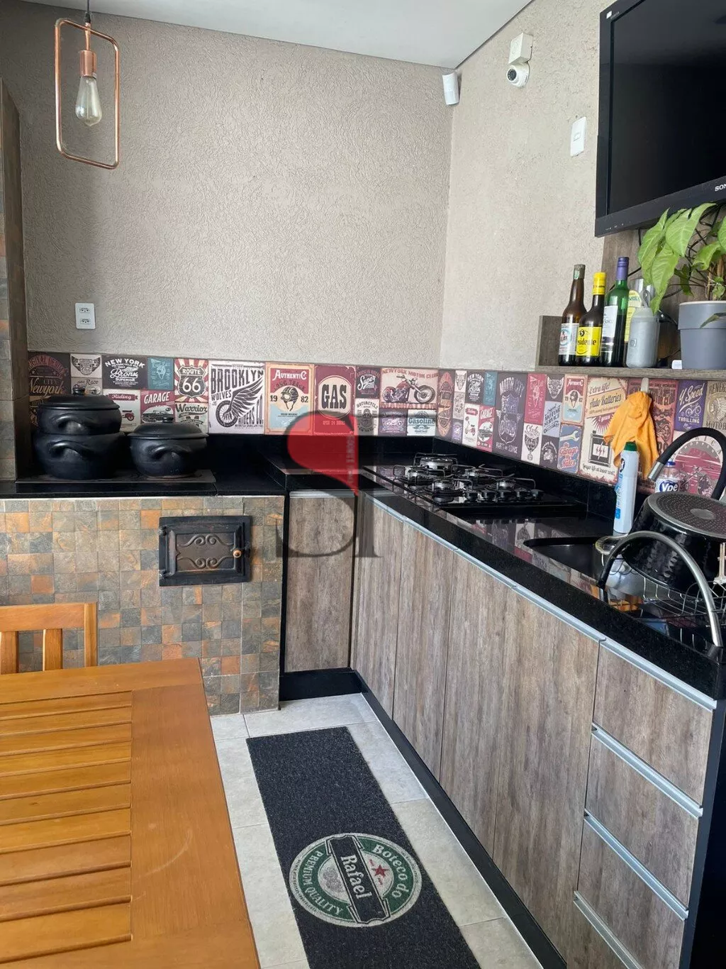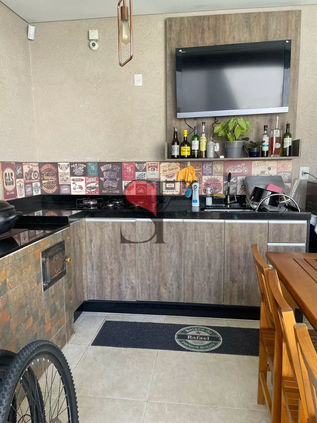 Área de lazer com churrasqueira, fogão a lenha e piscina, móveis planejados, cooktop 5 bocas . Iluminação moderna.