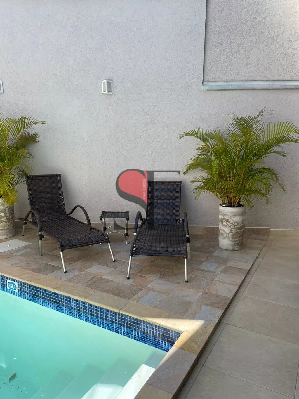 IÁrea de lazer com vasos, espreguiçadeiras e mesa de madeira maciça