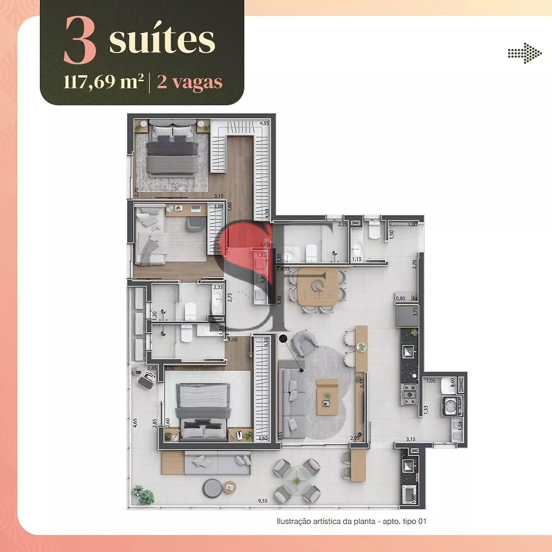 20 aptos. com 117,69 m² | 3 suítes | 2 vagas