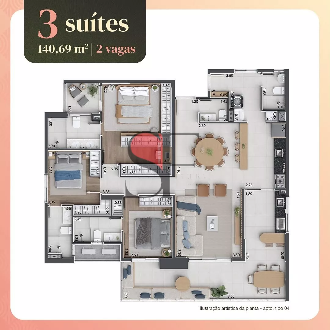 20 aptos com 140,69 m² | 3 suítes | 2 vagas